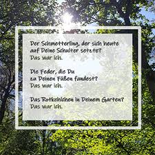 Die Abwesenheit unserer Liebsten hier im Diesseits ist unerträglich, sodass man sich auf das Wiedertreffen in der geistigen Welt freut, solange man noch getrennte Wege gehen muss UND IMMER AUF DIE KLEINEN ZEICHEN HOFFEN, DIE UNSERE LIEBSTEN MANCHMAL SCHICKEN !!