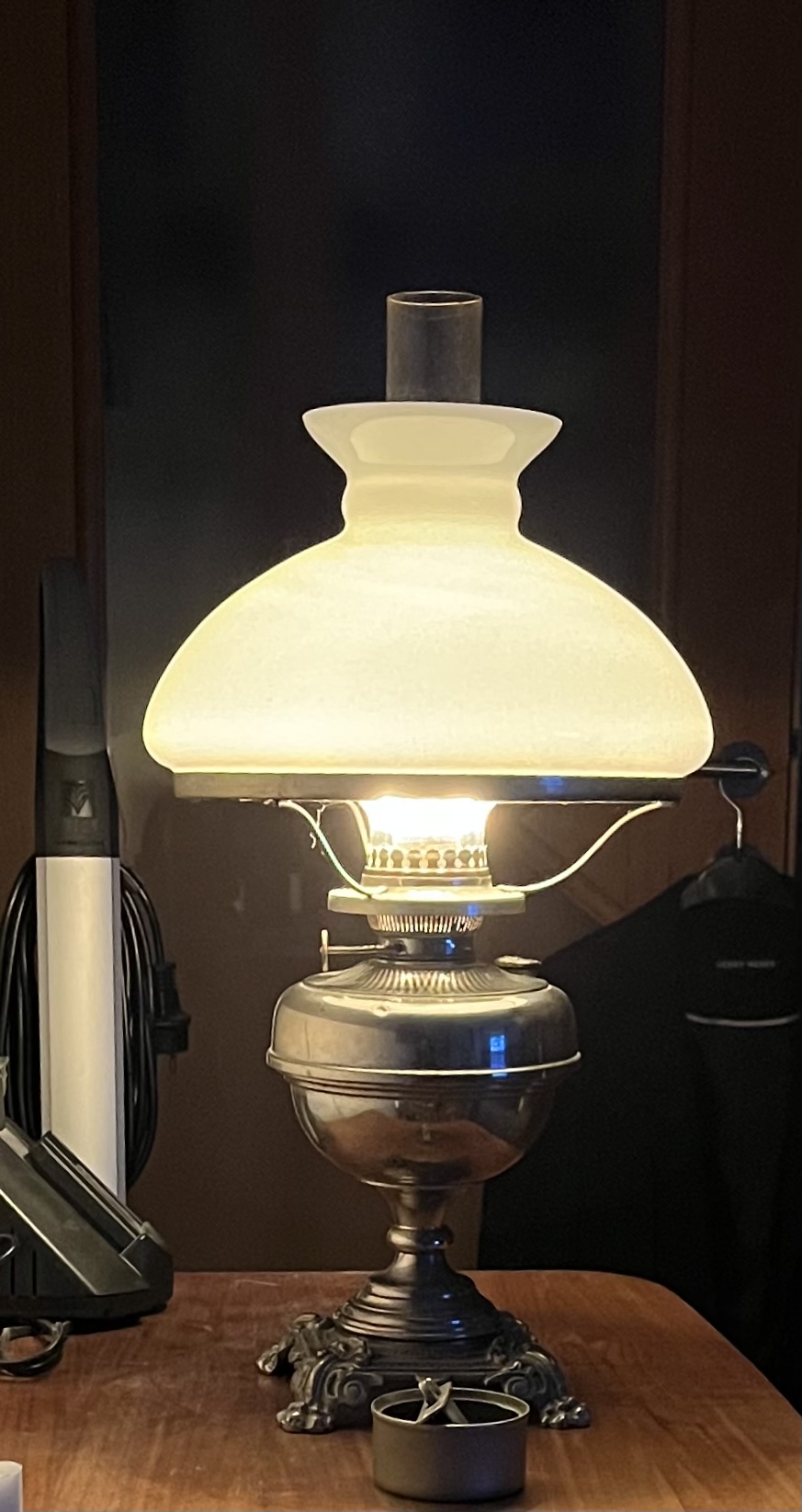 Zurück zur Lampe: Mein Elternhaus wurde also 1905 erbaut. Meine Großmutter erwarb das Haus 1955 zusammen mit ihren Schwestern. Damals übernahm man wohl auch einige Einrichtungsgegenstände, unter anderem eine Petroleumlampe. Die hatte meine Großmutter als Deko auf einem kleinen Tischchen stehen, ein geklöppeltes Deckchen darunter… solange ich mich erinnern kann, stand diese Lampe dort und faszinierte mich schon als Kind.