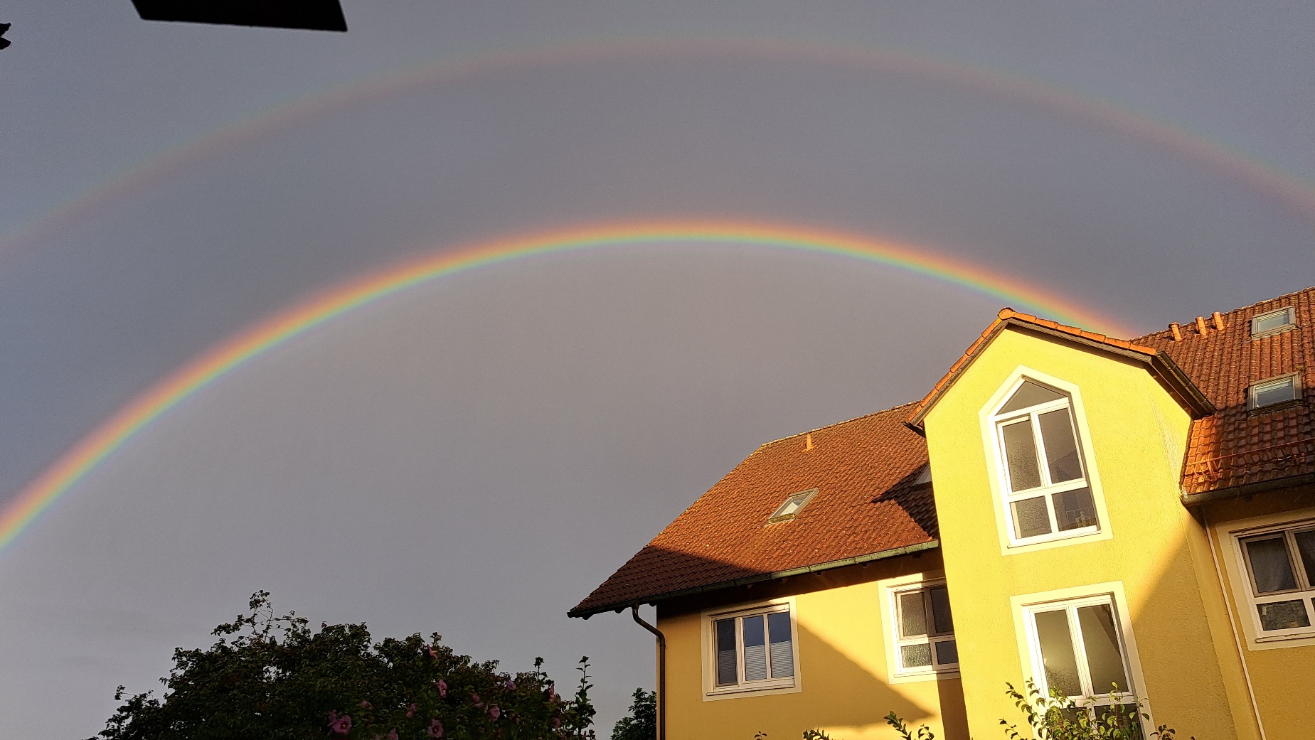 ...und vorgestern saß ich wieder traurig auf der Terrasse. Es schüttete, der Himmel grau. Plötzlich wurde der Himmel blau, die Sonne schien und ein herrlicher Regenbogen war direkt vor mir, sogar doppelt. So einen schönen hatten wir hier in 8 Jahren noch nie. Direkt vor mir. Das hat mich vollkommen berührt, ich habe geweint und mich bedankt. Es war wunderschön und dauerte ca. 10 Minuten. Danach war wieder alles grau und es fing wieder zu regnen an. 🌻