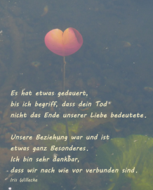 Meine süße 12-jährige Tochter war in den Sommerferien in einem Camp was hier von einer Jugendkirche ausgerichtet wird ... sie sieht mich ja nun leider auch immer wieder mal weinen, als sie aus dem Camp kam und ich mich weinen sah, meinte sie "Mama, Trauer ist eine Wunde und die Tränen spülen sie, damitsich nichts entzündet." Dann nahm meine Maus meine Hand und öffnete meine Faust (ich hatte gar nicht bemerkt, dass ich eine gemacht habe) und meinte "und man muss versuchen den Schmerz los zu lassen." ... so ist es wohl ...