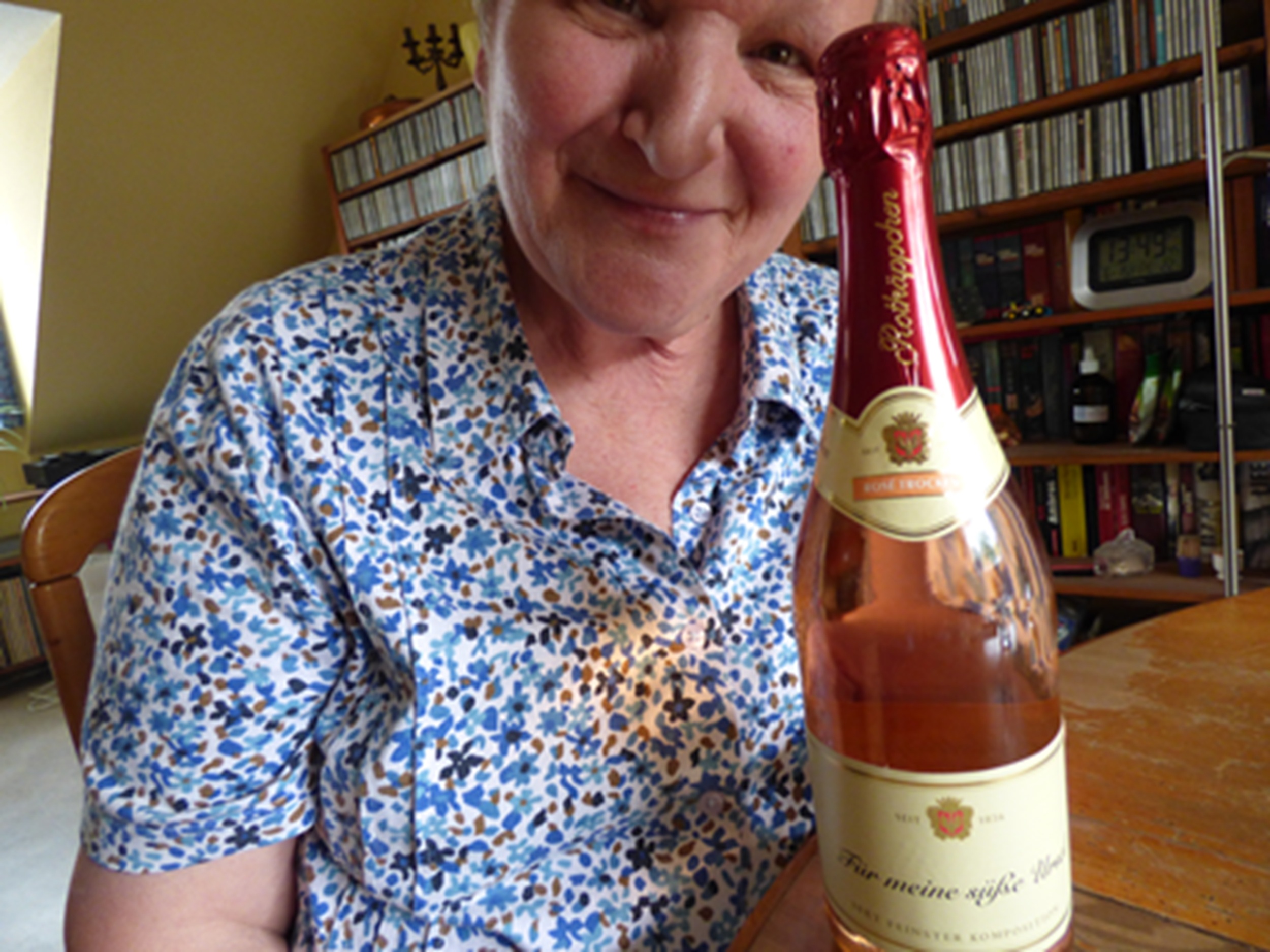Aber hier geht ein Bild mit ihrem Lieblingssekt, den jetzt ich abends bei unserem Gespräch trinke. Schaut mal was auf dem Etikett steht.